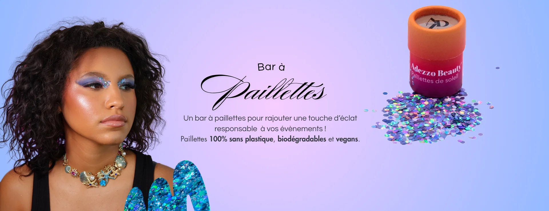Adezzo Beauty vous propose des animations maquillage pailleté sur-mesure, partout en Provence et au-delà. Nos artistes viennent sublimer vos invités avec nos paillettes biodégradables, vegan et sans plastique, pour des looks festifs, colorés et responsables. Que vous rêviez d’un style disco, bohème ou complètement féérique, on s’adapte à votre univers.