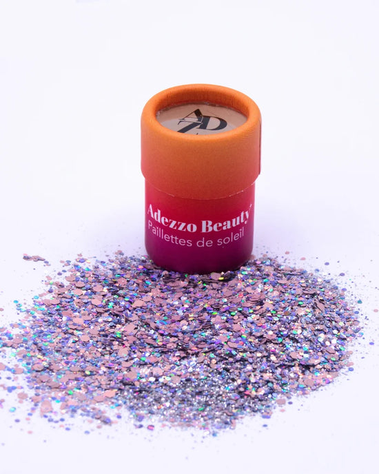Paillettes biodégradables, 100% sans plastique. Designées en Provence. Pour un maquillage festif : visage, cheveux, corps.