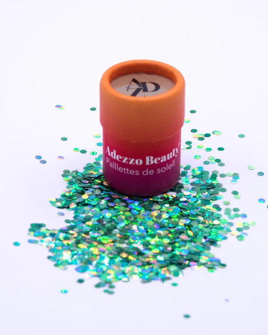 Paillettes biodégradables, 100% sans plastique. Designées en Provence. Pour un maquillage festif : visage, cheveux, corps.
