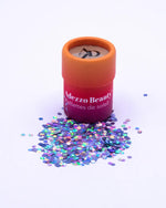 Paillettes biodégradables, 100% sans plastique. Designées en Provence. Pour un maquillage festif : visage, cheveux, corps.